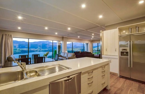 Walking into the home you are greeted by a grand foyer complete with chandelier and grand piano. Access is completely taken care of thanks to the elevator and substantial curved staircase. The foyer flows through into a large gleaming, contemporary kitchen, which is extremely well equipped: start with two ovens and steam oven, plus scullery or kitchen prep room and the all-essential expresso machine. You are spoilt for choice with where to relax after a long day delving into the region’s adventure sports activities, with a generous lounge and dining area, opening up onto the wrap-around balcony.