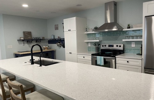 Apple Valley Lake spa-like retreat. Come to gather with your family and/or friends and relax in this newly renovated home on a quiet cul-de-sac. If you like clean and organized, this is the vacation spot for you. Everything is new including furniture, mattresses, Calphalon cookware, dishes and kitchen utensils. All mattresses and pillow cases protected with encased covers. Sit on the front deck or the back porch and enjoy the view of the lake and the wildlife (deer, hummingbirds, etc). The main floor has 3 spa-like bedrooms and 2 spa-like bathrooms. The main floor has a great gathering place with the kitchen open to the dining space and living space. Don't miss any touchdowns while you are cooking with the 65" Roku TV easily viewable from the kitchen. The kitchen is a gourmet chef's dream with all amenities. The downstairs walkout basement game room has an additional sectional sofa, 65" Roku TV, card table, , a kitchenette as well as a private bedroom with a queen bed and 1 rollaway twin bed and a full bathroom with shower. A 5-minute walk to Davis Beach. Pups are welcome, poop bags and a trash can on the back porch are provided for your convenience of cleaning up after your pup. Absolutely no smoking/vaping allowed on this property and a fine of $500 will be incurred if this rule is not respected. Exterior cameras in front and back of this property are in use for safety.