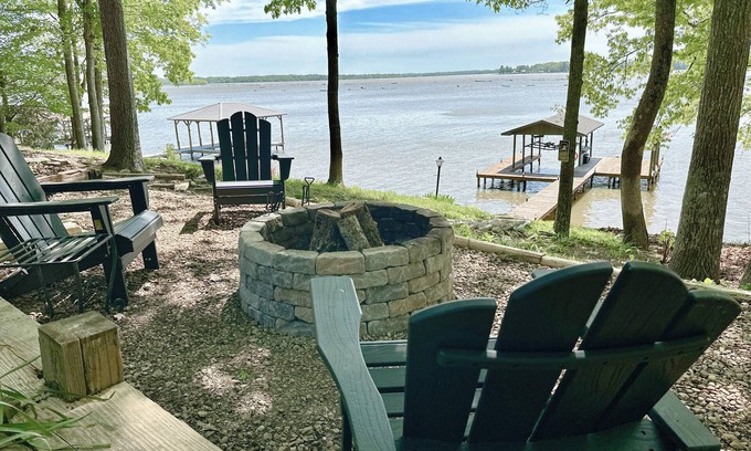 Step outside to enjoy a large deck with outdoor furniture, ideal for morning coffee or evening cocktails. The property also features a private dock for fishing, boating, and swimming. For evening gatherings, there's a fire pit with seating, perfect for making s'mores or sharing stories under the stars.
