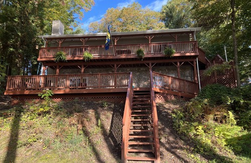 Sleeps 8: King bed in walk-out master bedroom , Queen bed in second bedroom, Queen bedroom with walk-out views on lower level, bonus room contains a trundle bed with 2 twin beds. Basement provides another gathering area with a wet bar, microwave, and full-size refrigerator. Your rental includes linens, towels. Just bring your personal items, firewood, charcoal, and relax.