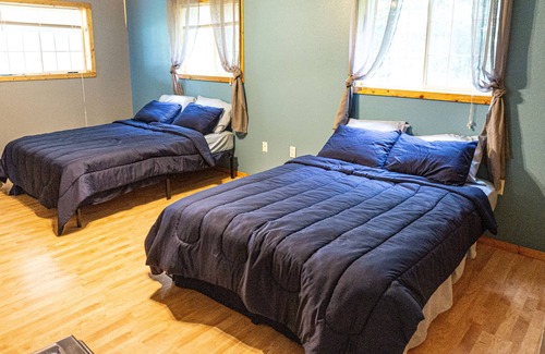 Stay a day or stay a week in our beautiful, rustic lake house with nearly all the amenities of home! Central living room with tv and fireplace. Full kitchen with all you need to cook, just bring food! 2 bedrooms, 1 with 2 full size beds and 1 with a queen size bed. We figure 2 people per bed and 1 per couch. There is plenty of additional room to set up air mattresses or cots if you have a bigger group. There is 1.5 bathrooms. We figure 12 people can fit easily but we provide beds for 6. Sit on the covered porch and enjoy the lake view or go jump off one of the 2 docks! Perfect for the whole family!