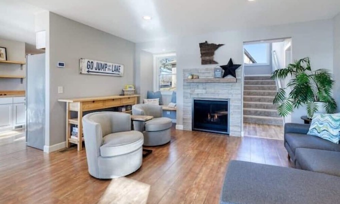Lakeside Retreat is located on Maple Lake with 4 Bedrooms / 2.5 Bath, lake facing windows, 3 decks, sandy beach, dock, plenty of yard space and firepit area, with space inside for up to 12 guests and a basement game room. Maple Lake is great for fishing, boating, and swimming fun. Beautiful sunrise views and amazing sunset from the beach or rooftop deck. Located just outside the Twin Cities this is your quick and easy getaway destination.