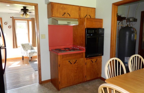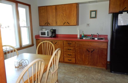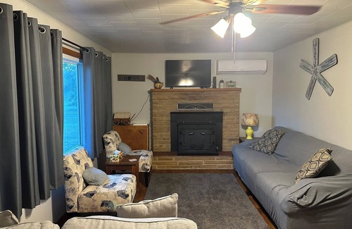 Location is everything with this charming 2 bedroom, one bathroom lake house that sleeps 6. This charming house features a King bedroom and a second bedroom with a Queen bed and a Full bed. There is a spacious living room, eat-in kitchen, laundry room, a newly renovated bathroom with a tub/shower surround, and efficient mini-split AC/Heat. The house has a fenced in backyard (great for Fido and the kids) with a patio set, charcoal grill, fire pit, and hammock and is on the county road going to our shared swimming/fishing dock (truck/SUV or walk). Access to Volleyball, basketball, playground, tons of outdoor games a pavilion and a fabulous lake view right next door!