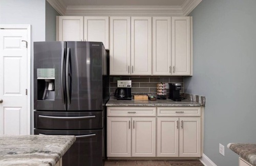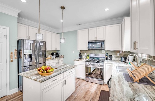 Upstairs, tranquility awaits in four beautifully decorated bedrooms, including a large primary suite with a king bed, smart TV, and en-suite bathroom. Two queen bedrooms and a twin/queen bunk room, all with walk-in closets, ensure comfort for every guest. A full laundry room adds to the convenience of your stay.