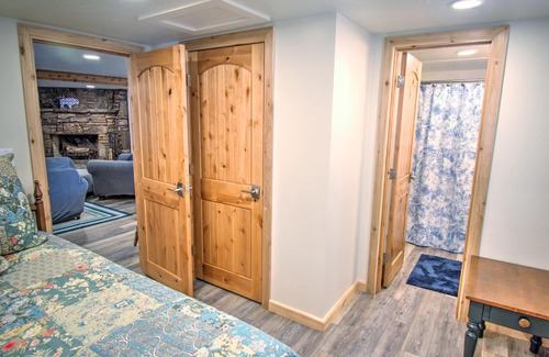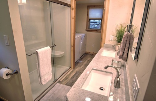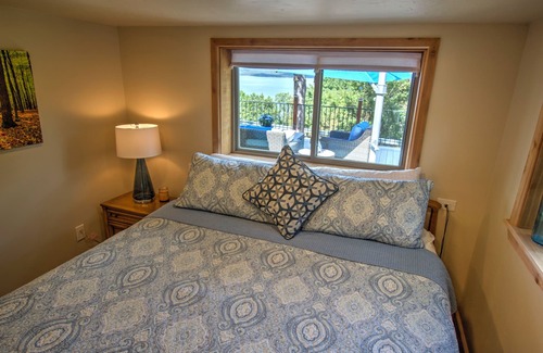Unexpectedly spacious 2 bedroom/ 2 bath enjoys lake views from both bedrooms and living rm, luxurious walk in shower, full size washer/dryer, fiber optic high speed internet, free WiFi, smart tv, Bluetooth speaker for cabin use, board/card games, central AC/heat, bath towels and bedding. A sleeper sofa in the main living area increases the comfortable occupancy to 6. Roomy, Fully equipped all electric kitchen and outdoor gas grill for cooking hamburgers/hotdogs or a thick delicious steak. A Wood burning fireplace makes for cozy winter getaways. The spacious deck extends your lake living providing plush, comfortable seating for gathering or just relaxing, large sun umbrella and gas fire table.