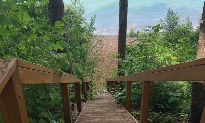 The bluff is high and the stairs are steep. There aren’t excessive railings so this cabin is not ideal for unattended children untrained pets, or those with physical disabilities.