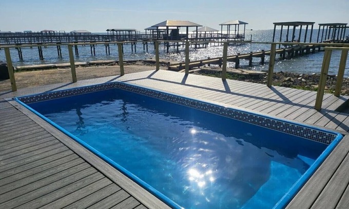 Lake Leisure is the perfect place to relax, unwind, fish, crab & enjoy Lake Catherine. Plenty of space with 3 bedrooms, 2 bathrooms, large living room & kitchen. First bedroom has a king size bed, queen sofa sleeper & en-suite bathroom with a bathtub, separate shower, two vanities & a large closet. Second bedroom has a queen bed & third has a full over full bunkbed & futon. The pool overlooks the lake & there is a large back porch & pool deck. The property is raised on piers with cargo elevator.