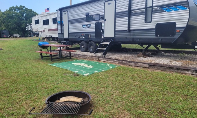 The camper has a picnic table, and a fire ring. Close to a playset. RV park has a great onsite store for bait and pizza.
