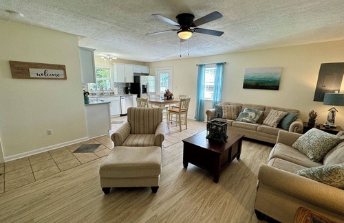 The kitchen is well stocked for your cooking needs with a full-size refrigerator, range, dishwasher, and microwave. There is also a full-size washer and dryer for use. Large family room with electric fireplace and 65" smart tv with Netflix.
