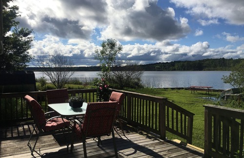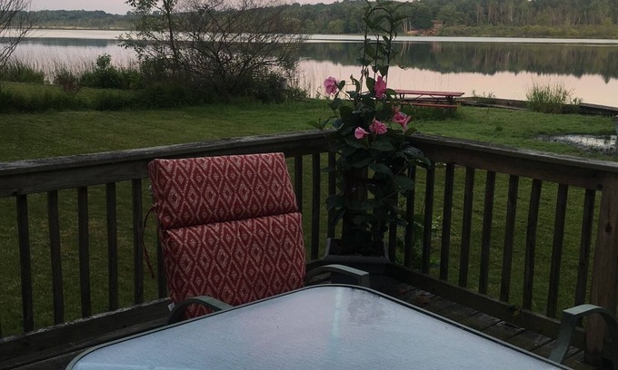 The cottage sleeps 6, has a deck looking over Bar Lake, gas grill and bonfire pit. Gas grill and table and chairs on deck.