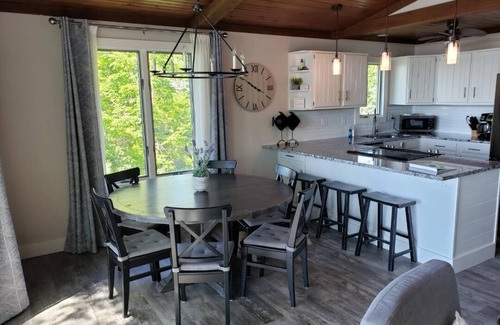The upper dining room table will comfortably seat 8 people, plus there are 3 bar stools at the counter and 4 additional folding chairs. The open concept living space allows everyone to be together, whether cooking, playing games or just hanging out.