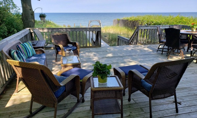 When you step out onto the spacious deck, you'll hear the waves and see the gorgeous panoramic views of Lake Michigan. Relax in the comfortable deck furniture or take a short stroll down the boardwalk towards the lake. Swing in the large wooden swing or enjoy a cup of coffee in the 2-seater Adirondack chairs/table which both overlook the water and beach below.
