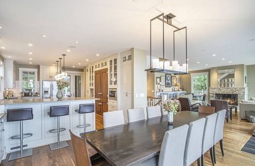 The main floor boasts stunning views, a beautiful fully stocked chef’s kitchen. Everything you will need for the cooking connoisseurs. Four burner gas stove, double oven, refrigerator, Keurig coffee maker, microwave, dishes and utensils along with top-of-the-line cooking knives. Napkins and tablecloths included to create a gorgeous dining experience! Island seating for four, as well as a dining table that seats ten. The other side of the great room offers seating for all around the fireplace and Samsung Frame TV. Also located on the main floor is a King Bedroom with an ensuite bathroom, as well as a spacious family room area with big screen TV. Laundry room and half bath are also on this floor.