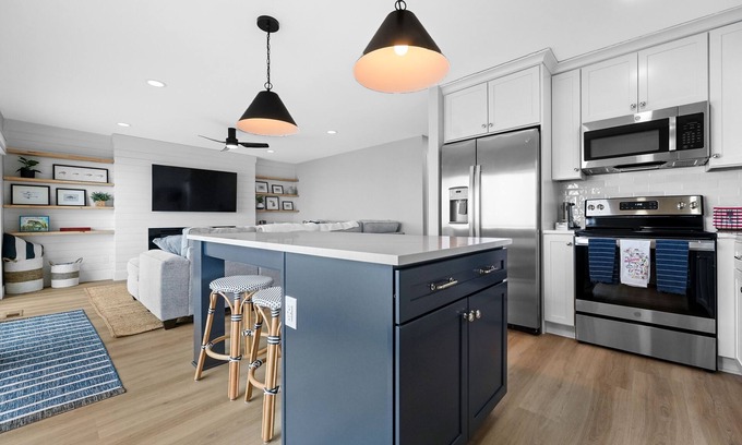 UPSTAIRS LIVING: 65" TV, electric fireplace, full-wall shiplap shelving, double 8' doorwalls with floor-to-ceiling views, brand new eat-in kitchen with quartz counterops and pantry, large sectional sofa, open floor plan, full bath with tub/shower combination, access to outdoor deck