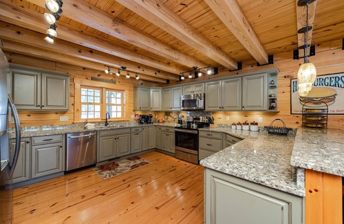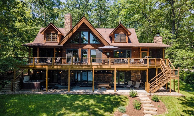 Curb appeal alert! The charm of this elegant lakefront home is hard to miss! With a large back deck and a beautifully furnished interior, your friends and family will feel right at home from the moment you step inside this warm and wonderful lake chalet. The main level of this home features a great room and kitchen that is just bursting with top of the line amenities, premier home furnishings, and modern upgrades. You’ll find the home’s lower level to be equally accommodating, with plenty of space for everyone, along with fun features like a wet bar and foosball table. The covered back porch- with an outdoor fireplace and plentiful seating- is the perfect spot to gather together to celebrate the close of day, the sun setting over still waters and your loved ones laughing by your side. Celebrate the best of lake life with a stay at Lake’ N Logs!