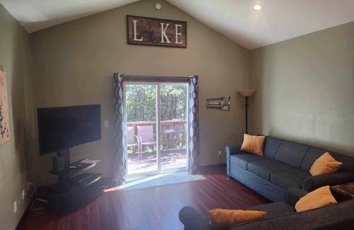 Angler's Roost is a 2 bedroom, 1 bath cabin with an open floor plan and cathedral ceilings located less than one half mile from Jordan Marina. It is decked out with top amenities that include a flat screen TV with HD satellite service, multi-jet jacuzzi tub, separate full-size shower, refrigerator with ice machine, electric stove, microwave and coffee pot, charcoal grill, large back porch, large dining table with seating for 6.