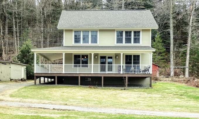 Relish your vacation on Lake Rescue in this new 3BR/3Ba home, with bonus Bunk Room. Private 77ft frontage and dock. Large lawn for games and relaxing with great views for all seasons! Chef's kitchen with custom granite countertops, stainless steel appliances, and cherry cabinets. Remote button starts your roaring fire in the glimmer stone fireplace after a day on the slopes at Okemo or Killington. Relax, making memories, playing games or having meals on the wrap-around farmer's porch. Perfect for families, and sleeps up to 10 guests. Okemo Mountain, Okemo Valley Golf Course, and Ludlow -- a foodie destination, are all 5 minutes away