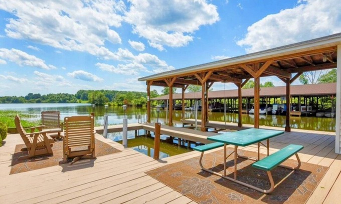 This spacious home on Lake Anna (piblic side) features gorgeous panoramic views of the lake and sunsets. Featuring 7 bedrooms, multiple common spaces to hang out, play games, and watch TV, an expansive deck with lounge furniture, HOT TUB, and outdoor firepit, plus lakeside boathouse with beach, deck, lounge furniture, firepit, and kayaks. A boat slip can accommodate your boat. Great for family reunions, girl's or guys weekends, and retreats. Fully equipped kitchen, game room, several group TV areas.