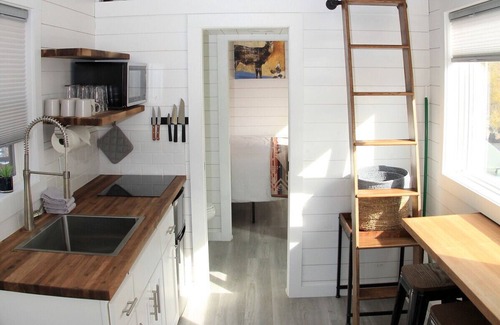 Experience our exclusive lodging and stay in one of our luxury tiny homes! This spacious, 200-square-foot unit features a queen-sized bed with comfortable sleeping for two in a private bedroom and a loft with a twin-sized bed. Both mattresses are made of 100% organic latex and covered with high-end linens, pillows, and wool Pendleton blankets for those crisp, high desert nights in the stars. There is also a full-sized futon for extra guests featuring linens upon request.