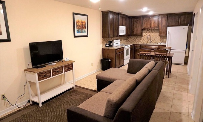Living room has a small sectional for you to sit back and relax while watching cable on a large flat screen T.V.