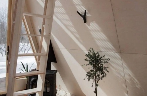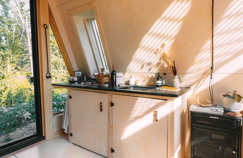 Built for travelers seeking a retreat in a sustainable stay, we designed this cabin to offer all the necessities one would need in thoughtfulness of nature: wood fired sauna, solar power for lighting and charging electronics, gas fireplace and stove, A-frame outhouse and rain barrel collection.
