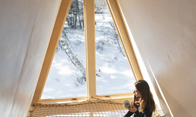 Float among the stars and aurora gaze in the hanging loft net. This idyllic woodland setting is home to fox, bear, deer, eagles, wolves, and even possibly a wandering moose.