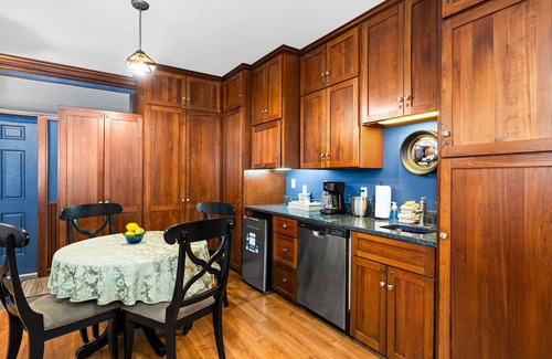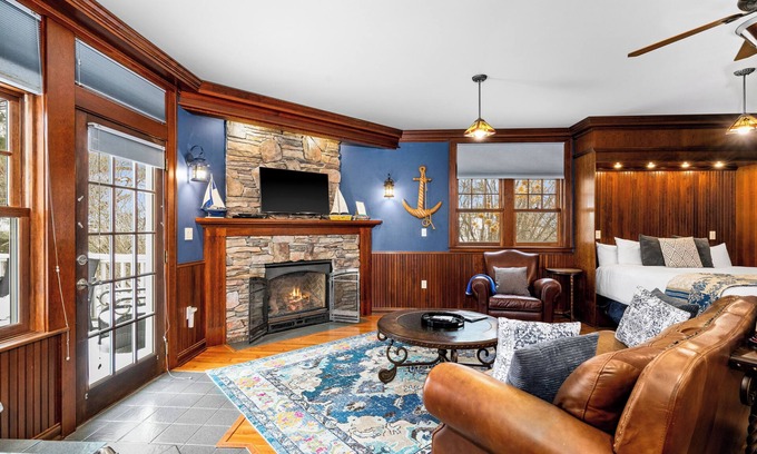 This large private carriage house room features a king-size bed, private bath with walk-in shower, in-room Hydro Massage whirlpool tub for two across from an incredible ledge-rock fireplace, A/C, heated floors, leather sofa, Smart TV, kitchenette with a microwave, fridge, coffee maker and four person dining table. French doors open to your private deck nestled amid towering pines and park-like grounds. Fully handicap accessible. This room offers access to two acres of private grounds as well as the elegant yet comfortable common areas of the mansion.