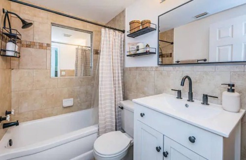 Completely updated bathroom equipped with a bath and over-the-head shower.