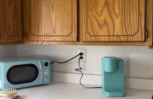 Kitchen with full size cook stove, refrigerator, Keurig coffee maker dishware/flatware, pots/pans and bowls.
