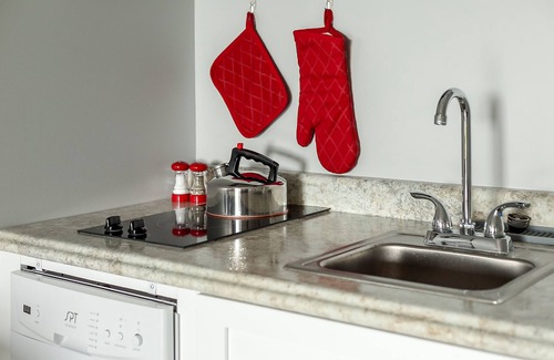 The kitchen is equipped with an oven, a refrigerator, and a dishwasher, as well as a microwave, cookware, and a rice cooker. Other amenities at this 1-bedroom, 1-bathroom rental include an ironing board and luggage storage.