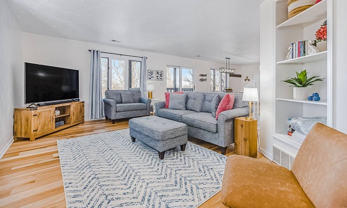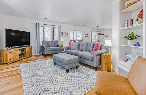 There's four floors to enjoy at this home, with comfortable spaces on each one! After stopping off the lift or stairs, just walk right on in to the lowest floor, you'll find the first bedroom of the home just past the sitting room. This first bedroom features a queen bed, extra seating, and two windows with a view of the deck. The second bedroom is just next door and features a queen bed with a one-window view. A full shower/tub combination will serve the guests on this floor. Up the outdoor stairs, the second floor is just for entertainment - relax on the couch and set a movie to play on the big-screen TV!
