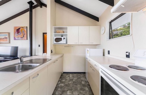 This charming bach has an open plan lounge, dining room and fully equipped kitchen opens out onto a vast deck over looking trees and towards the lake.