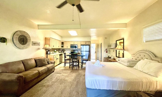 Our Lodge King Studio has one king bed and a queen sleeper sofa.