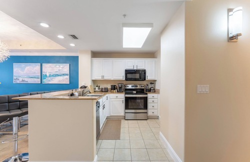 The kitchen area is stocked with cooking appliances, spacious countertops, a dining area, including a raised bar counter with stools for extra seating. If you want to take a break from local restaurants, or make a few quick and easy meals, this is perfect!