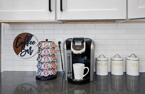 You'll love cooking in the gorgeous remodeled kitchen with quartz countertops, tile backsplash, large sink, and coffee station. The kitchen is fully stocked with all the cooking utensils you need.