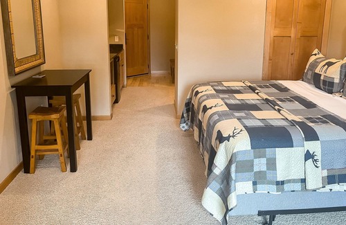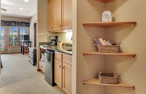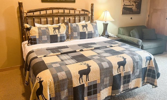 The studio features incredible Deer Lake views from its private balcony, a kitchenette complete with a mini-fridge, microwave, and coffee maker, central AC, a TV with cable, a comfortable bed and sofa, and a full bathroom with a tub/shower.