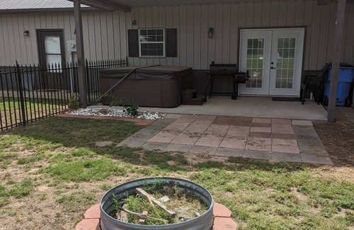 Master bedroom has a king MyPillow mattress and a newly remodeled attached bathroom with a roll-in shower and wall mounted counter for easy accessibility from a wheelchair. Second bedroom has an adjustable queen bed. Third bedroom has a full over queen bunk bed with a twin trundle bed. These two bedrooms share a full bathroom that has a swivel transfer seat available upon request. Hot tub on back patio. Fenced area. Two covered car ports. Washer and dryer. Above ground storm shelter. Charcoal Grill.