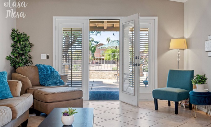 Sit on the back patio and watch the sunsets over the adjacent lake, and soak up the sunshine in this lovely Phoenix east valley home. This home-away-from-home is in the Superstition Springs area of Mesa, and is fully appointed and professionally designed for your comfort and enjoyment. Walk to the nearby movie theatre, or try out the many restaurants and shops nearby.