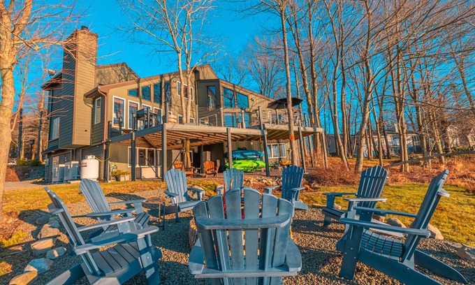 Waterfront Poconos living at its best. Lake views from every room. 5 bedrooms (incl. bunk room) with 8 beds for 10 guests to sleep. 2-story game room with TV separate from living/sleeping quarters. Enjoy a nap in the hammock, a book by the fireplace, suntan on the private beach (coming Spring 2022), or a kayak trip on the lake or river. There is something for everyone at West End Pond! Please be sure to take note of the house rules.