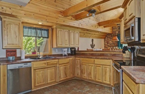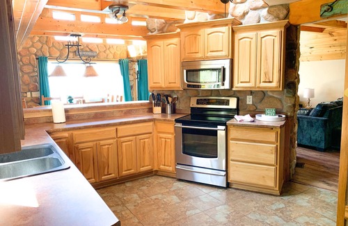 "A" frame log cabin with private master suite, full bath and loft upstairs. Main level includes 2 bedrooms and full bath. Open concept main areas with floor to ceiling fireplace. Walk out doors to lake views. Wi-Fi.