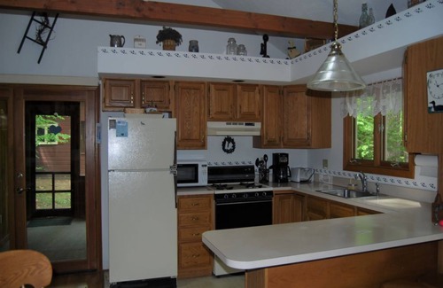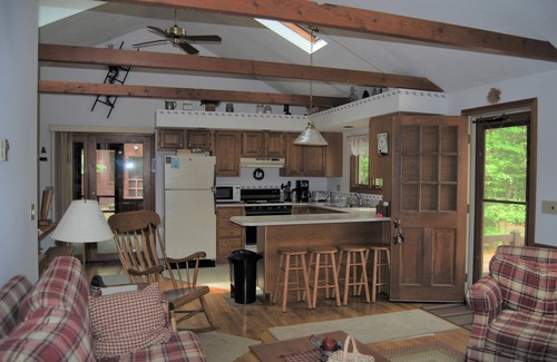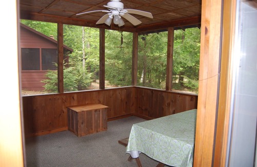 Nestled in a grove of tall pines, you will find Deepwood Lodges. A wonderful community of 17 cottages that share a large sandy beach and use of boats like kayaks and a canoe. Cottage 4 has an open, cathedral ceiling living / dining / kitchen area. One bedroom has a queen bed, the other 4 bunks. There is also an den with a bed. Most guests spend their day at the beach but the screen porch on this cottage makes for lovely evenings.