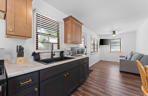 Recently remodeled, this cabin has everything you need for a comfortable stay. The fully stocked kitchen includes full-size appliances, a microwave, coffee maker, cookware, dishes, and all the essentials for home-cooked meals.