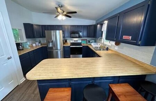The main tv is a Smart TV with chromecast and apple play compatibility, the master bedroom has an Amazon Fire TV and the 3rd TV has a Fire Stick. Netflix is provided. Bring your electric vehicle and 14-50 charger to plug into the 50 amp outlet to recharge for your trip home. The house has a king, queen, 4 twin bunks, and 2 futons. Every night stand has a wireless phone charging block. The kitchen is amazing and stocked with tons of goodies like 2 different sizedcrockpots, air fryer, mixer, a Keurig and standard coffee maker, blender, and an electric kettle. There is a charcoal grill but charcoal is not included. Doggy clean up is a breeze with the waste station. Feel free to use the provided bags and drop them in the trash container. We will handle the rest.