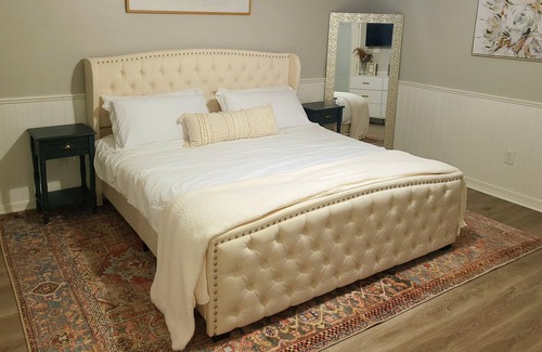 The home can accommodate up to 8 guests plus a baby with the 3 beds/bedrooms (1 King, 2 Queen), 1 Queen blowup mattress, and a crib.