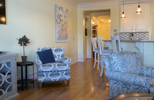 Inside you will find a beautifully furnished 3-bedroom/2 bath condo with a fully renovated kitchen, along with a coffee bar. The large private main bedroom includes a plush king bed, tray ceiling, cozy seating, and a TV. The en suite has two sinks, soaker tub, shower and a separate toilet. There is also access to the balcony form the main bedroom. The kitchen is stocked with cooking essentials and has a breakfast bar with four stools, and updated appliances. The second beautifully decorated bedroom has a queen bed, while the cute third bedroom has two twin beds. Both are close to the 2nd full bathroom which includes a tub/shower combo. The open floor plan living room is just off the kitchen and features plenty of comfortable seating, TV, fireplace, tasteful decor along with access to the cozy balcony. Perfect for your family!