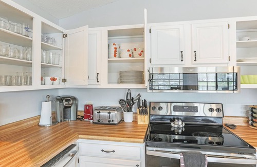Perfect lake escape for 2-3 families! 4 bedroom 2 bathroom cottage renovated in 2021 with 2 family rooms. Fully stocked kitchen with SS kitchen appliances and new living room furniture and flooring upstairs and pool table downstairs. Large screened in porch with comfortable lounge seating and table/chairs for dining both inside and out. Working fireplace both upstairs and downstairs. Bed linens, blankets, pillows and bath towels provided. Propane grill with tank on lower patio. Newly installed high speed internet. Large grassy lawn with gentle slope to waterfront. Spacious dock with deep water. Cleats/bumpers to tie up your boat or jet skis. No use of boat lift. Kayaks and paddleboard available for your use along with large water mat. Steep gravel driveway down to house. Located in popular Six Pound Creek- mile marker 15.5; close to main lake. Many restaurants within 15-20 minutes by boat or car.
