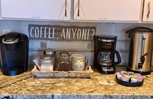 The gourmet kitchen is a chefs delight, featuring numerous small appliances, two ovens, and a spacious island ideal for big breakfasts. Enjoy multiple ways to brew your coffee, including Keurig pods in various flavors, teas, hot chocolate, and sugar. Five bedrooms offer queen beds with ceiling fans for cool nights, while the renovated downstairs bathroom accommodates all with a stool and adjustable hand-held shower head. The upstairs master suite pampers with a king-size bed, 180-degree lake views, a private deck, work station with printer, and a luxurious shower with multiple heads plus a soaker tub with a fireplace at your feet and a lakeview.
