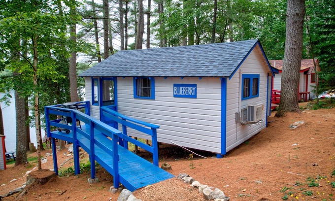 This newly remodeled Maine & Blueberry themed tiny cabin is nestled among the tall pine tree shoreline of Toddy Pond. The cabin is located in the back row of cabins, as seen on the map in the listing images. You will love this Blueberry themed tiny cabin! Tucked away in a 9-cabin resort on the beautiful gravel shores of Toddy Pond, you’ll have the opportunity to swim and kayak in the crystal-clear water, relax at the shady picnic tables beneath the towering pine trees, view local wildlife, enjoy at-home necessities, and easily access nearby towns! This is truly a special and unforgettable place! Bring your pets, we are very pet-friendly. You can escape the heat and cold in the cabin with the brand new central air conditioning and heating units.
