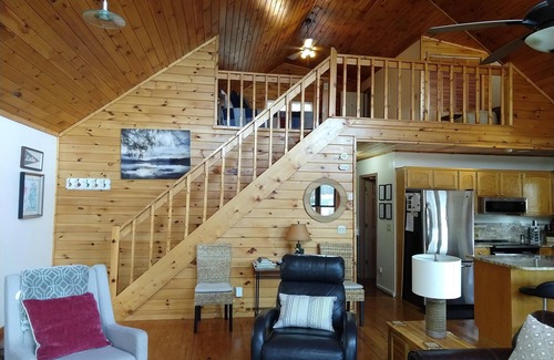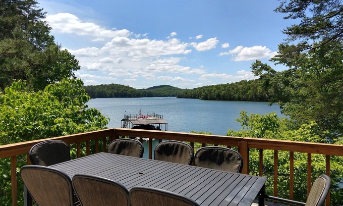 Our lake getaway is the perfect place for lake fun including fishing, swimming, hiking, kayaking and boating, Magnificent lake views can be seen from inside and outside the house. Large windows, French doors, lakeside hot tub, and screened porch have lake and mountain views. Loungers, dining tables, fire table, rocking chairs, and swinging chairs just outside the doors on the large decks. Hot tub lake views just outside the lower deck doors. Only 25 feet separate guests from the lower deck steps to the shoreline. It may be difficult to access the lake for those with mobility issues because steps are along the path and down a hill to the dock ramp.