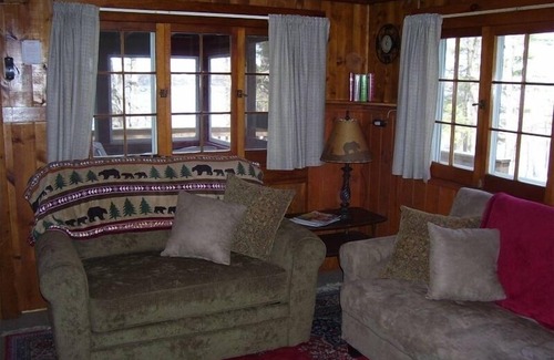 The interior is all knotty pine. It has 2 bedrooms, a newly remodeled kitchen, dining area, living room with free standing gas fireplace, a new bathroom and a new screened porch with breakfast table and a large deck. It comfortably accommodates five. 14' rowboat is included with the rental. Two kayaks are stored at the cabin and are provided at no charge for our guests to enjoy.